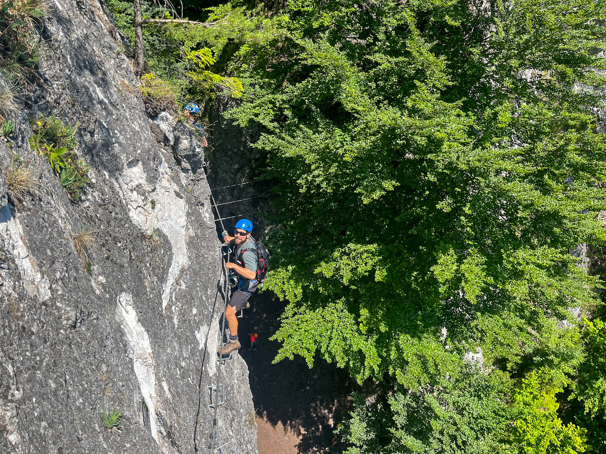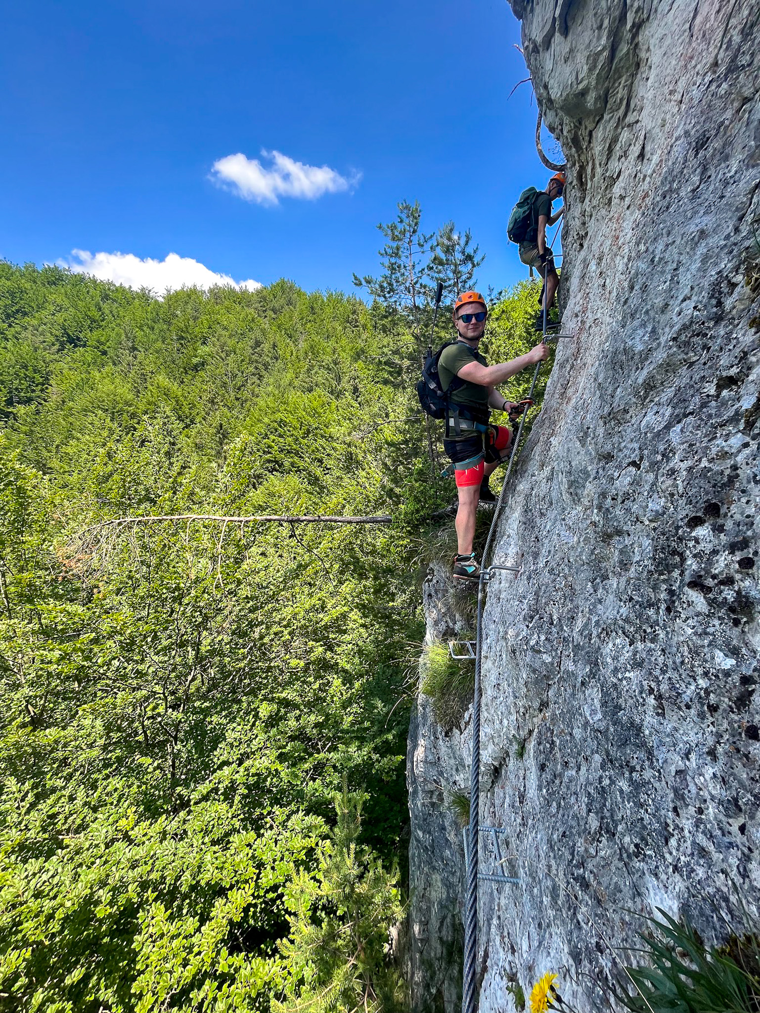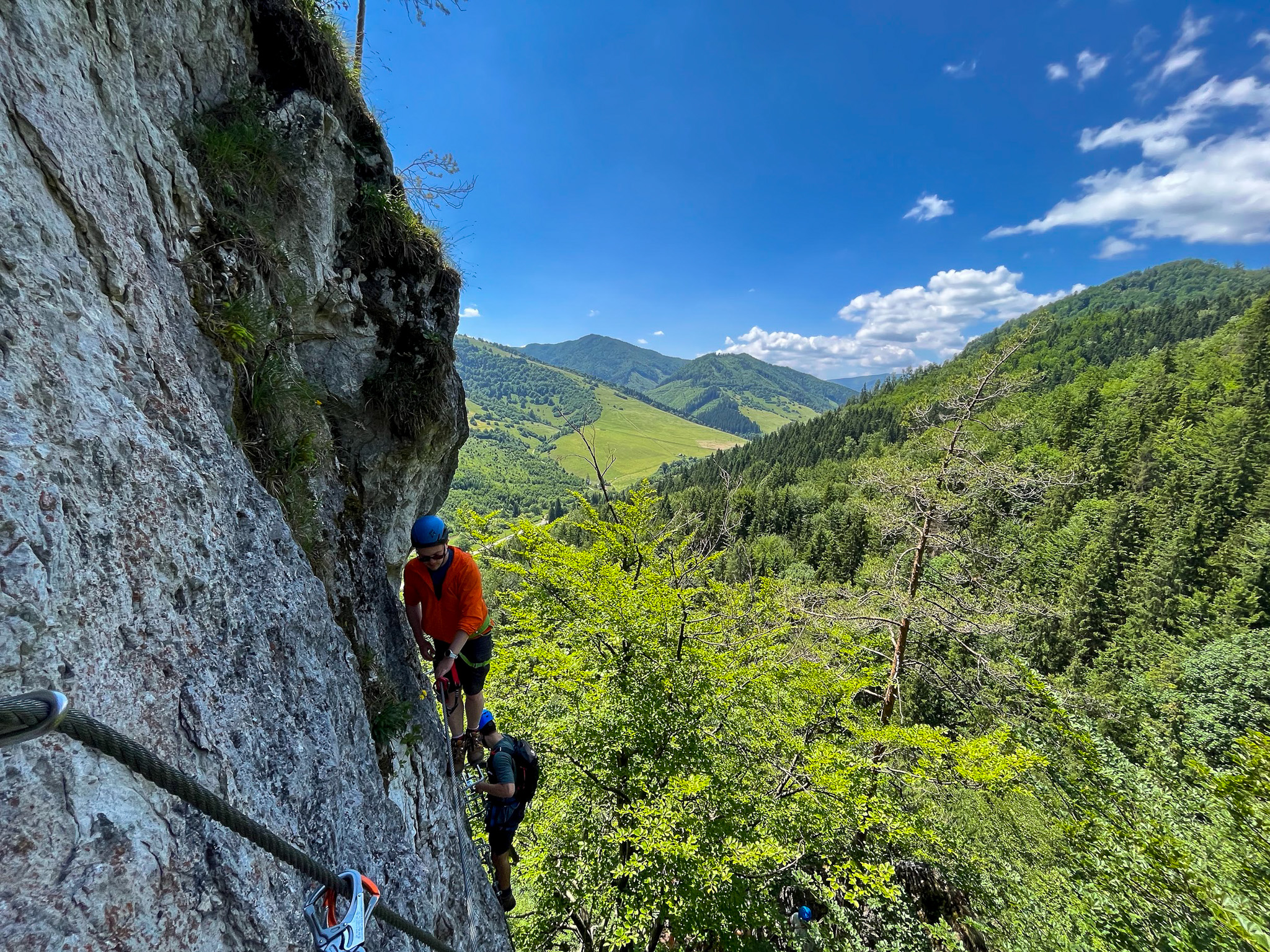 Dla większości z nas to pierwsze spokanie z ferratami, jest więc trochę emocji, ale raczej wszystko jest pod kontrolą. Kazda droga kończy się na szczycie jednej lub drugiej turni, skąd do podstawy schodzimy stormą ścięzką ubezpieczoną liną. Po trzech godzinach zabawy wracamy do auta.