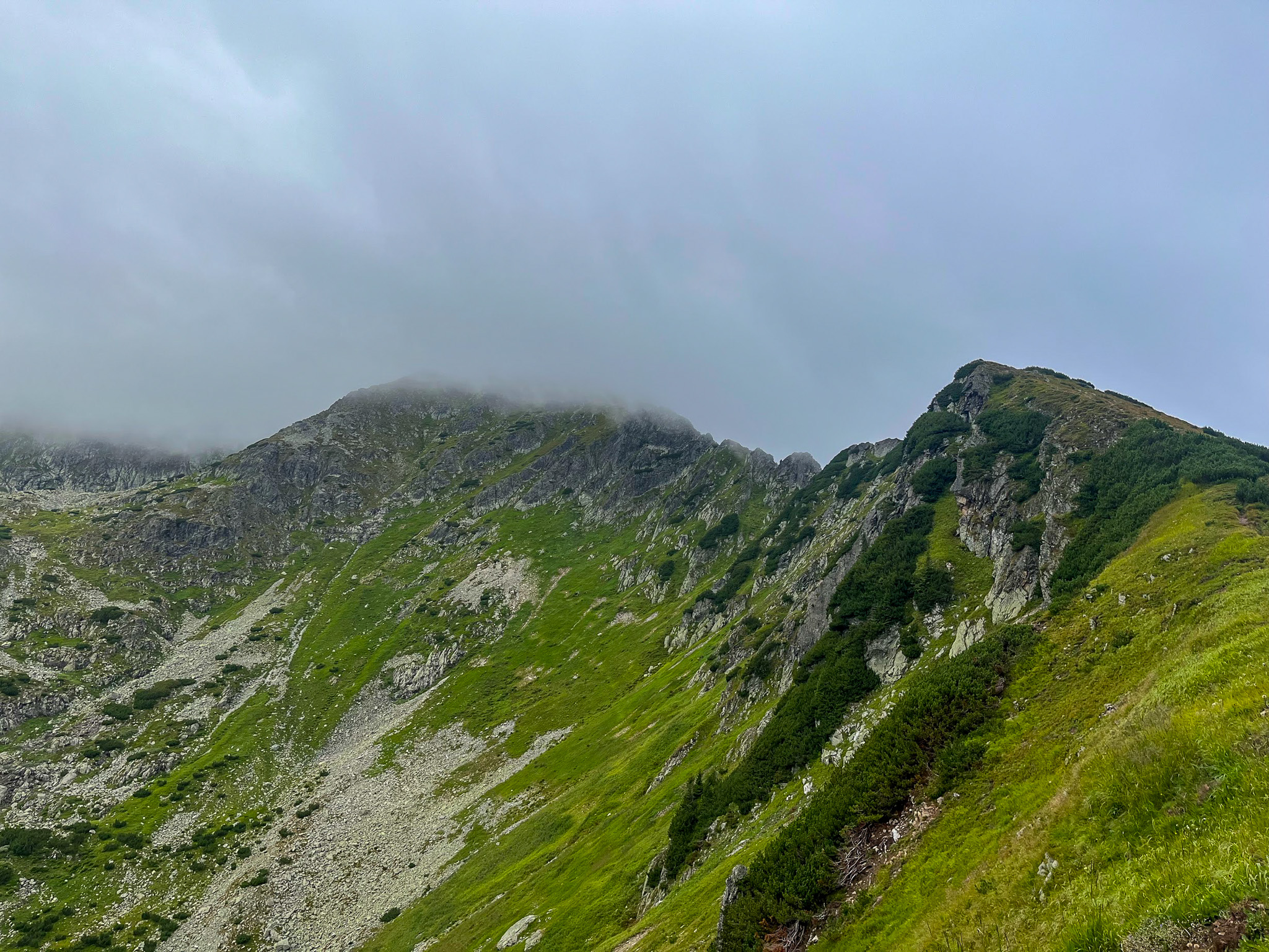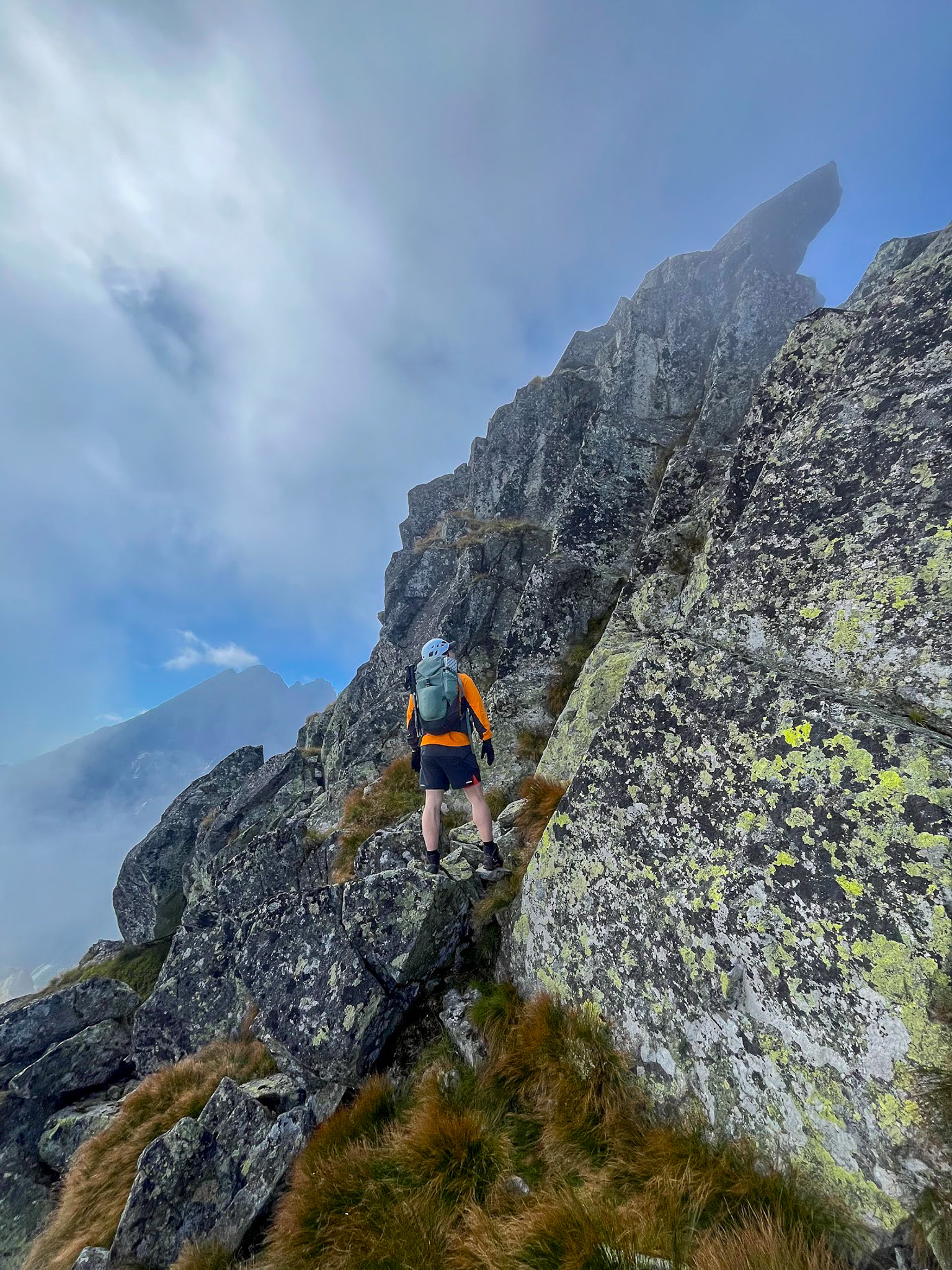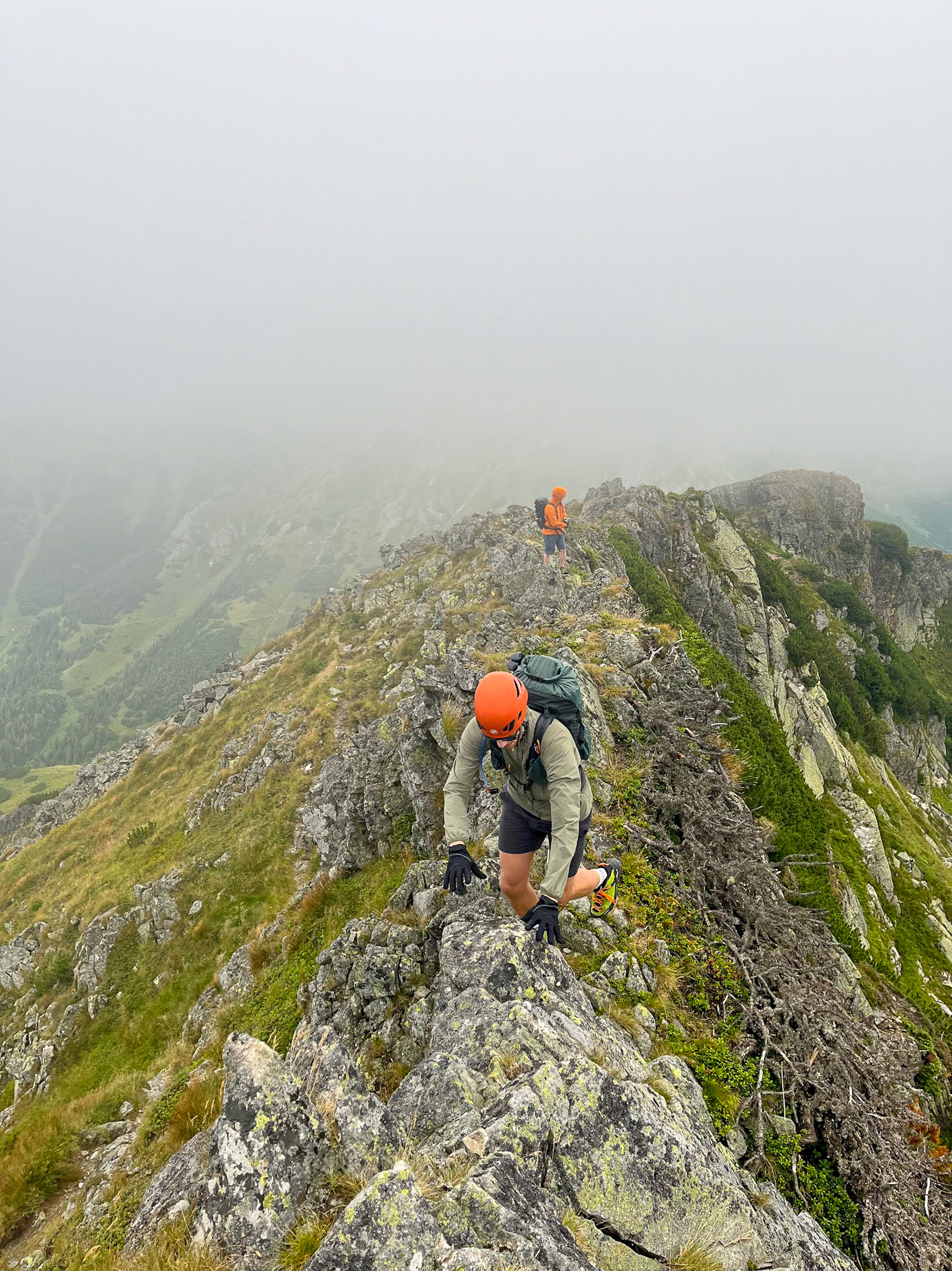 Koperszadzka Grań początkowo prowadzi przez trawiasty teren, później chwile przez kosówkę, a potem już litą skałą pnie się w górę do samego szczytu. Postanawiamy nie iść ścieżką obchodzącą główne trudności od północy, tylko cisnąć granią ściśle na tyle, na ile to możliwe bez asekuracji (pamiętamy o tym, że w latach ‘40 prowadził tędy szlak, a fragmenty próby jego odbudowy z lat ‘70 jeszcze gdzieniegdzie widać). W co trudniejszych miejscach potem trochę tego żałujemy, bo od chmury, która naszła na całą dolinę, skała jest momentami bardzo mokra i śliska.