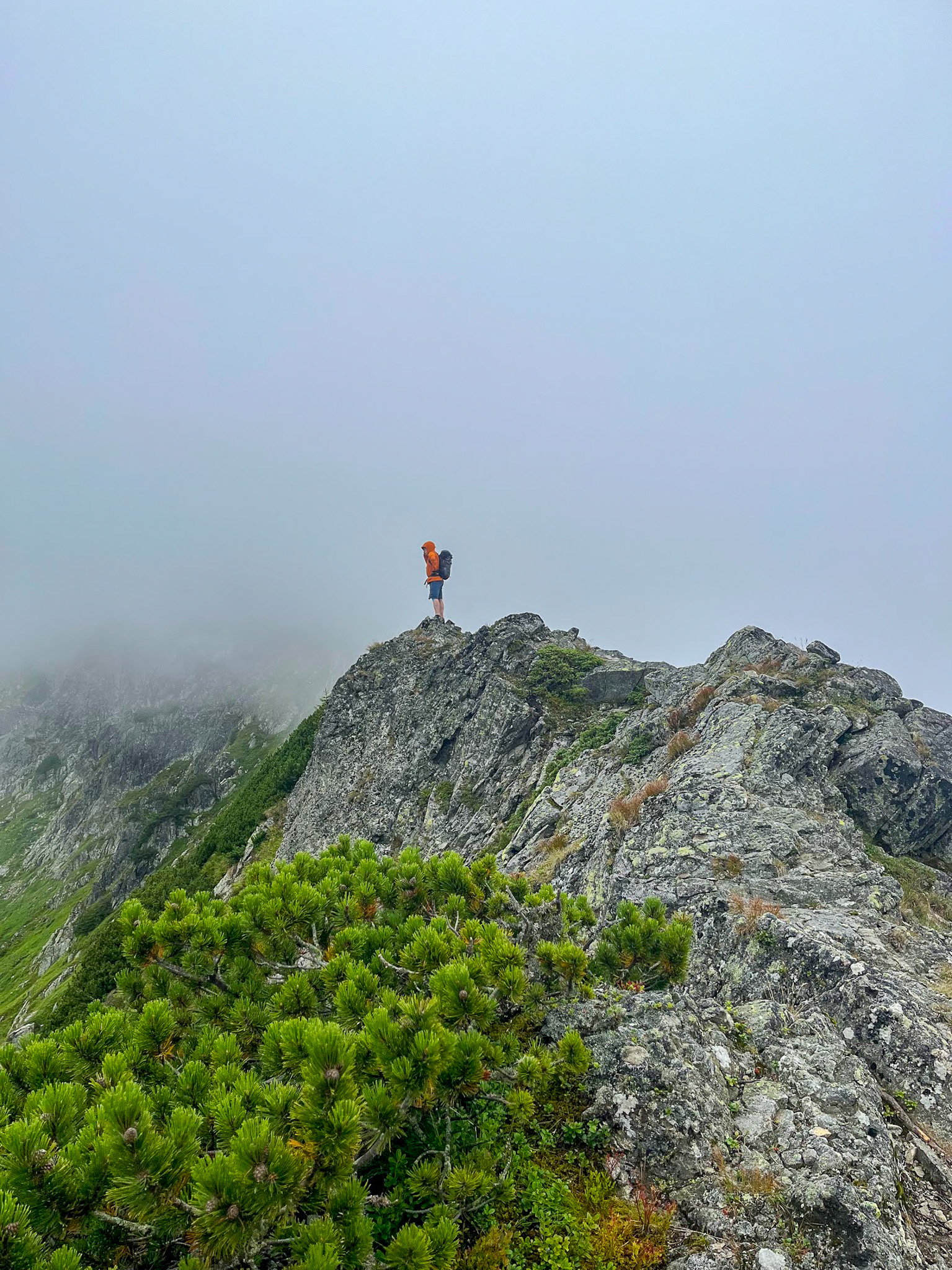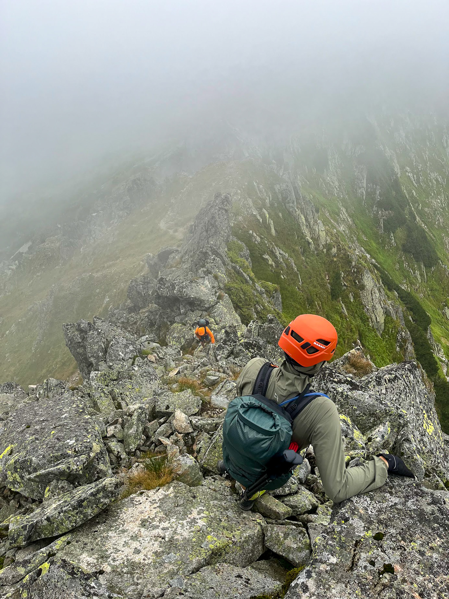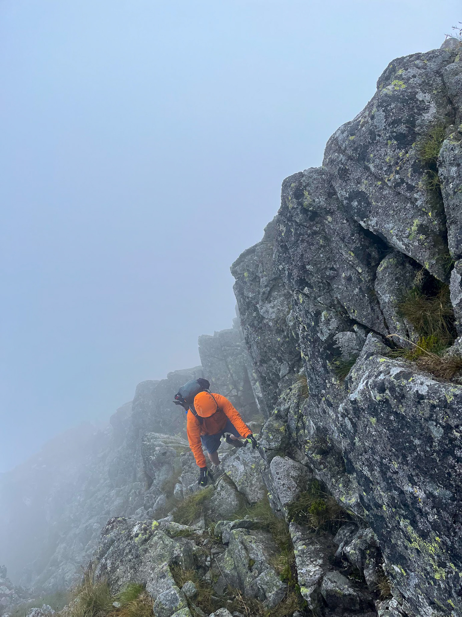 Koperszadzka Grań początkowo prowadzi przez trawiasty teren, później chwile przez kosówkę, a potem już litą skałą pnie się w górę do samego szczytu. Postanawiamy nie iść ścieżką obchodzącą główne trudności od północy, tylko cisnąć granią ściśle na tyle, na ile to możliwe bez asekuracji (pamiętamy o tym, że w latach ‘40 prowadził tędy szlak, a fragmenty próby jego odbudowy z lat ‘70 jeszcze gdzieniegdzie widać). W co trudniejszych miejscach potem trochę tego żałujemy, bo od chmury, która naszła na całą dolinę, skała jest momentami bardzo mokra i śliska.