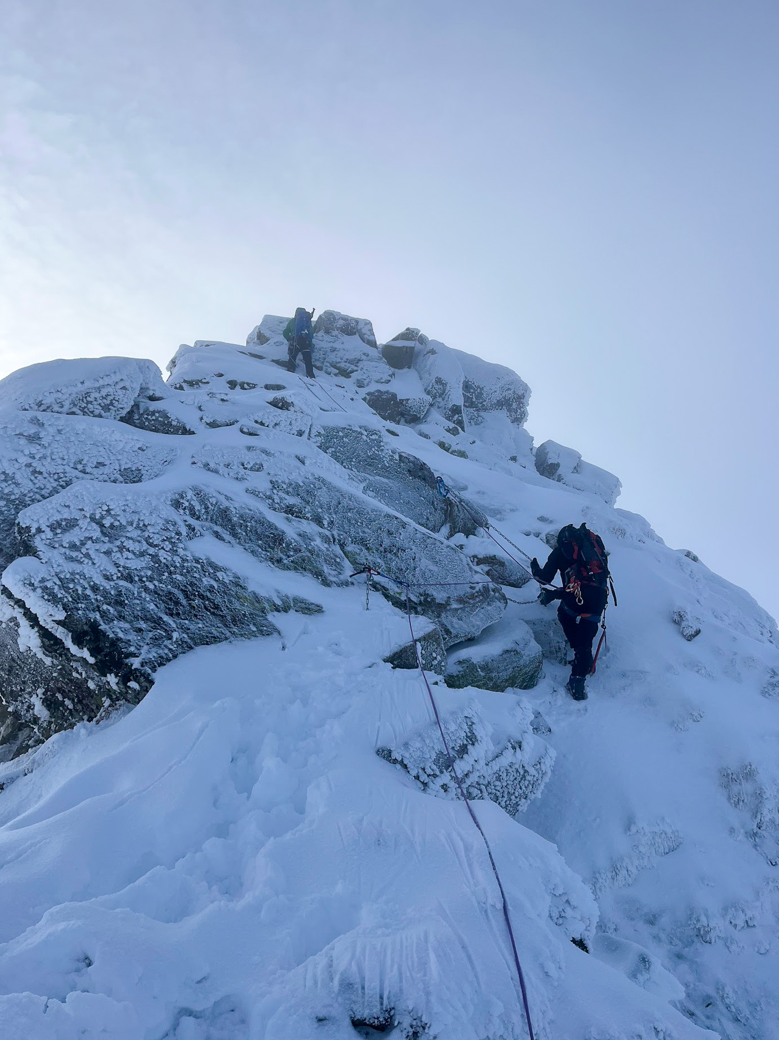Z Wołowca schodzimy, dalej torując, na Jamnicką Przełęcz, gdzie szpeimy się i asekurując pniemy do góry. Odbijamy duzo bardziej na lewo od letniego szlaku, ta droga wydaje nam się bezpieczniejsza. Poruszamy się na lotnej, w ruch idzie kilka taśm, średniej wielkości friendy i jakieś kości.