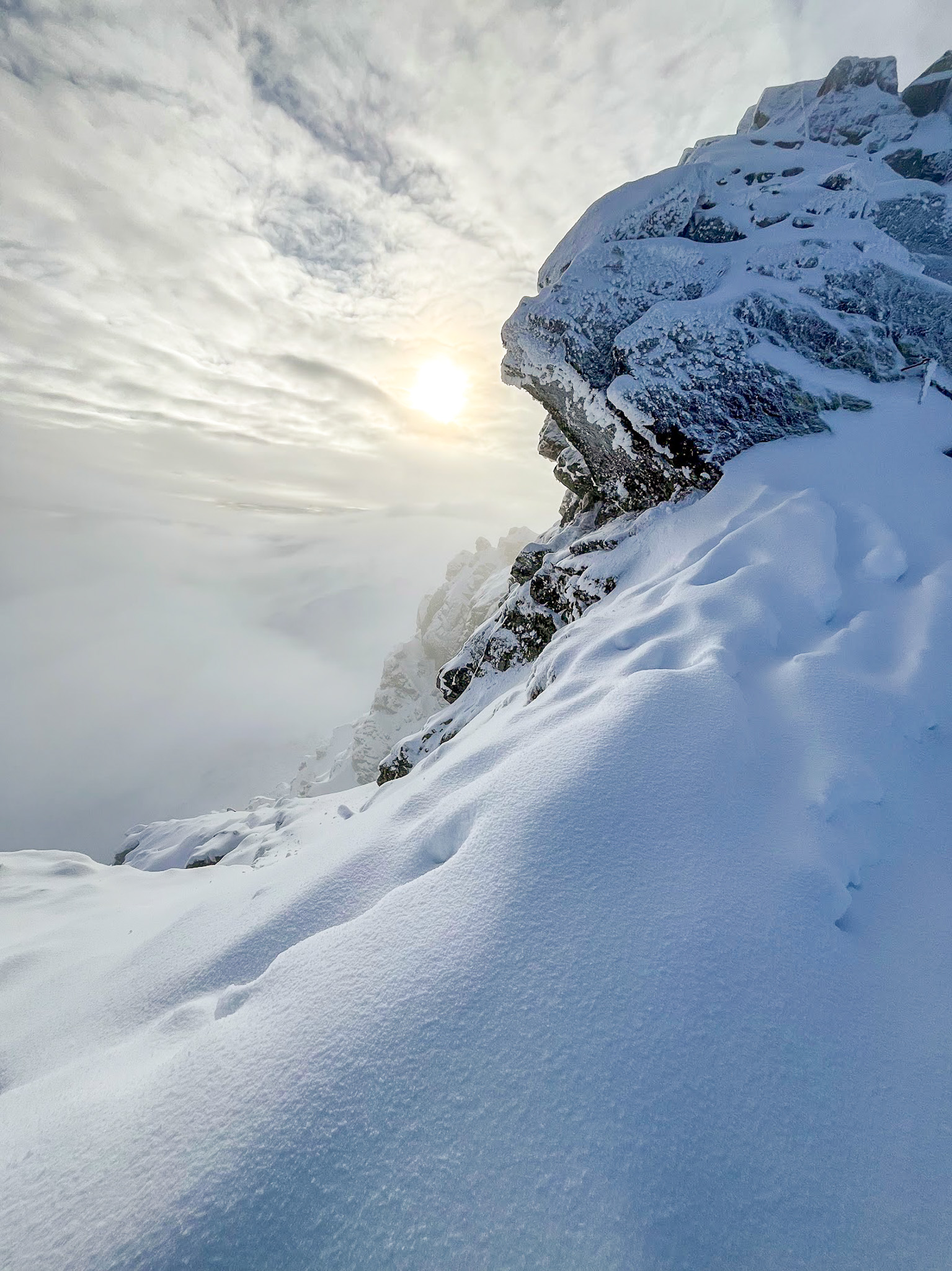 Przed Rohackim Koniem wykopujemy ze śniegu łańcuchy i tkamy przeloty do ich kotew. Konia przechodzimy dość czujnie, a jego widok w niezmączonym śniegu zapamiętam jako najpiękniejsze co w tym roku widziałem. Oczywiście nie byłbym sobą gdybym był inny i przewracam się okrutnie i dramatycznie zaraz przed Koniem i wbiłem sobie raka w udo (update grudzień 2025 - blizna nadal jest).